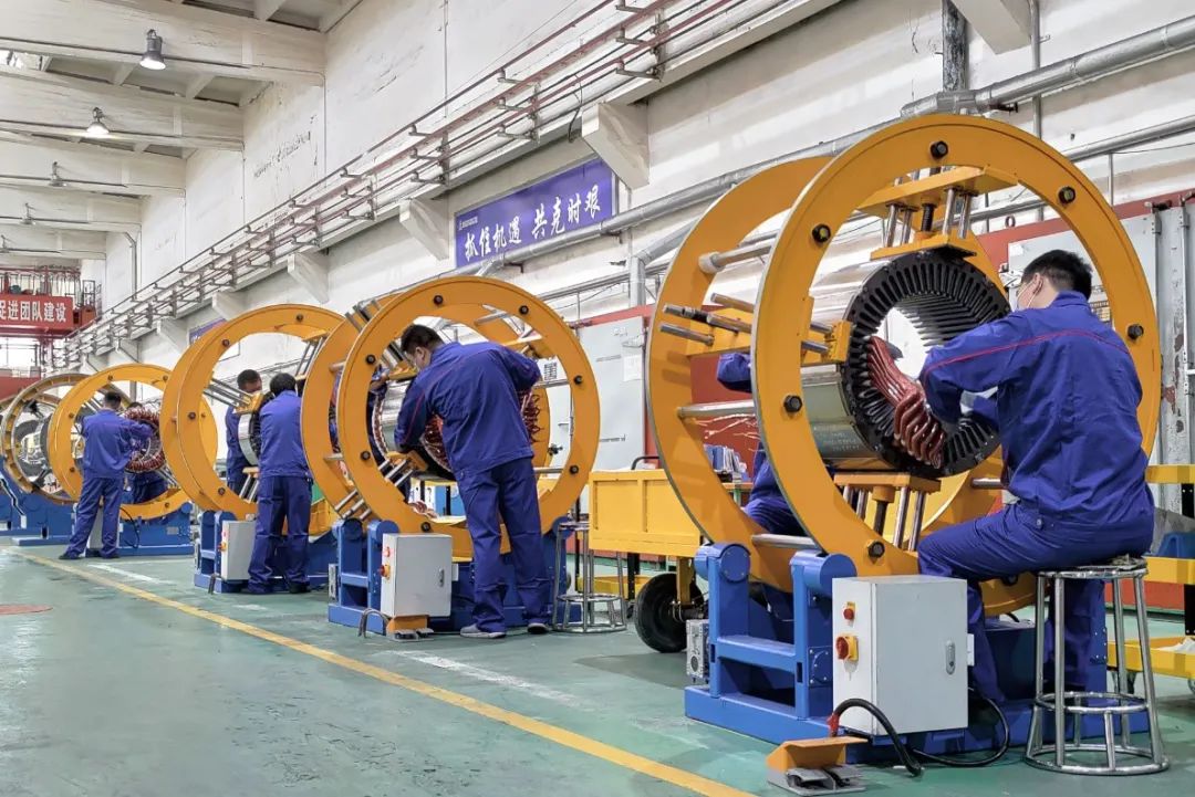 哈電集團佳電股份電工車間有繞組定子鐵芯嵌線操作現(xiàn)場