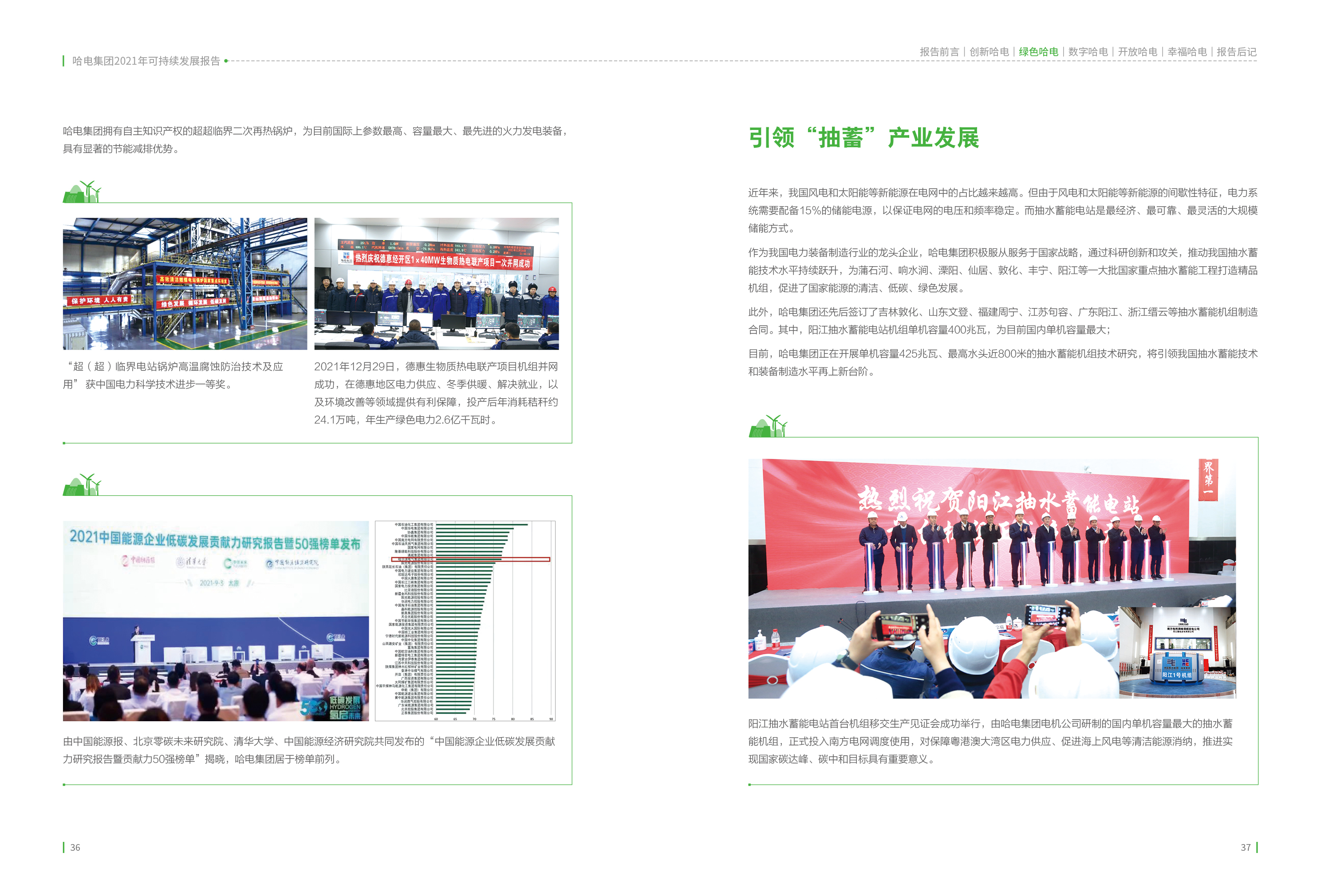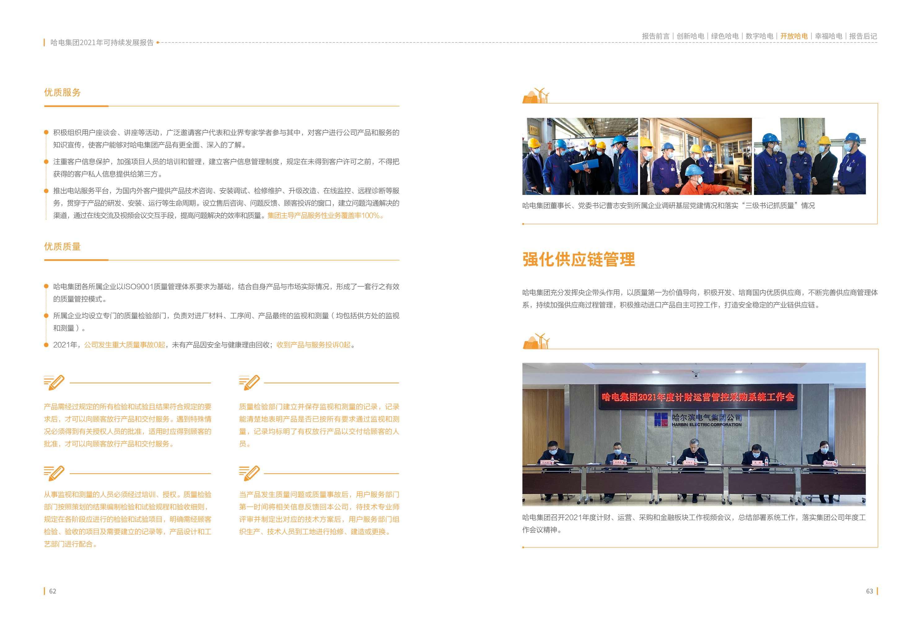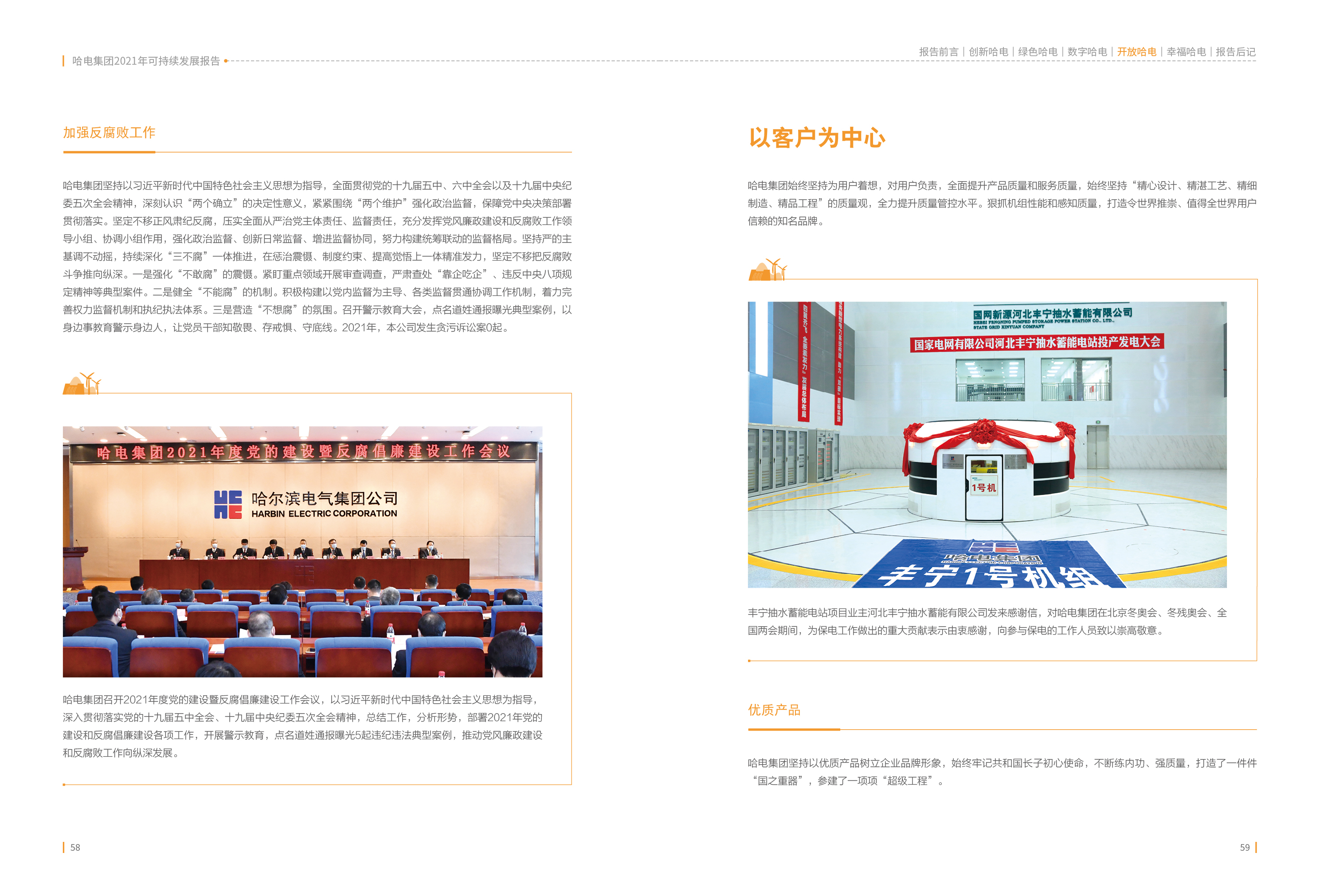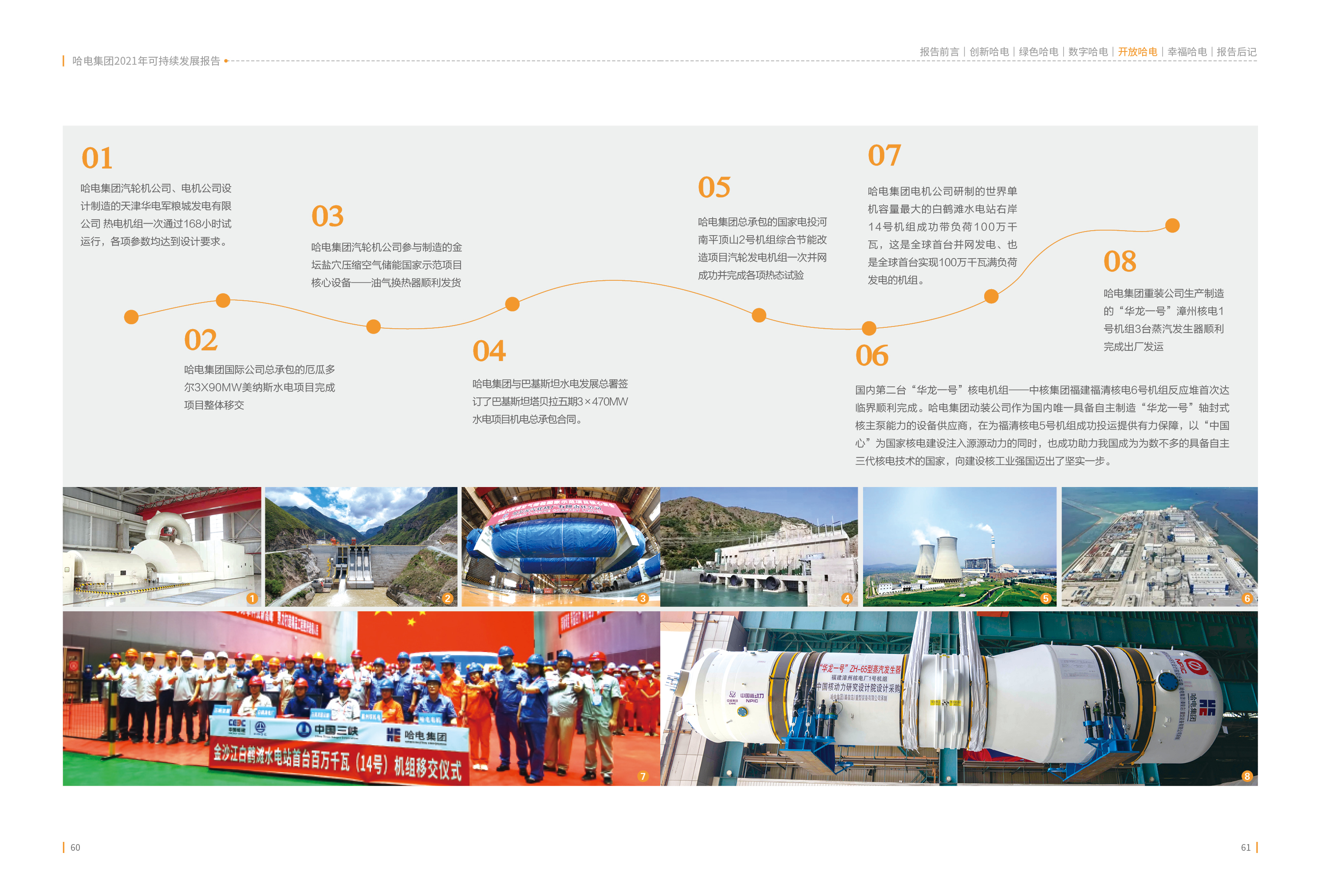 《哈電集團(tuán)2021年度可持續(xù)發(fā)展報(bào)告》以“創(chuàng)新哈電”、“綠色哈電”、“數(shù)字哈電”、“開放哈電”、“幸福哈電”為主體內(nèi)容,全面展現(xiàn)哈電集團(tuán)2021年在改革發(fā)展、客戶責(zé)任、貢獻(xiàn)社會(huì)、保護(hù)環(huán)境、愛護(hù)員工等方面取得的成績(jī)。通過“以高質(zhì)量黨建引領(lǐng)高質(zhì)量發(fā)展”、“70載書寫光榮與夢(mèng)想”、“白鶴亮翅盡展大國(guó)重器——為全面踐行‘雙碳’戰(zhàn)略目標(biāo)貢獻(xiàn)哈電力量”、“履行政治責(zé)任、助力鄉(xiāng)村振興”、“沉淀企業(yè)文化、凝練哈電精神”五個(gè)責(zé)任專題,聚焦哈電集團(tuán)在黨建引領(lǐng)、70年發(fā)展歷程、打造精品工程、助力鄉(xiāng)村振興、沉淀企業(yè)文化等領(lǐng)域的重點(diǎn)工作成效,彰顯了中央企業(yè)的責(zé)任擔(dān)當(dāng)。