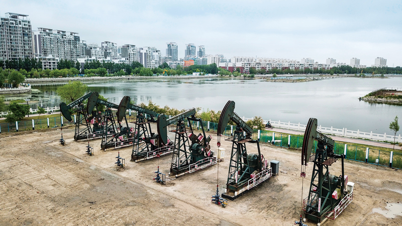 經(jīng)過半個多世紀(jì)艱苦創(chuàng)業(yè),大慶油田不僅扛起了“共和國加油機”的神圣職責(zé),為保障國家能源安全作出巨大貢獻(xiàn),而且著力打造了一座人與自然和諧相處、原油生產(chǎn)與環(huán)境保護(hù)相得益彰的“綠色油化之都”。圖為大慶油田叢式井坐落在市區(qū)燕都湖旁。 新華社記者 王建威/攝