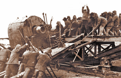 大會戰(zhàn)時期,王進(jìn)喜(中)和鉆井工人們?nèi)死缈高\(yùn)鉆機(jī),保障鉆井作業(yè)。(資料圖片)
