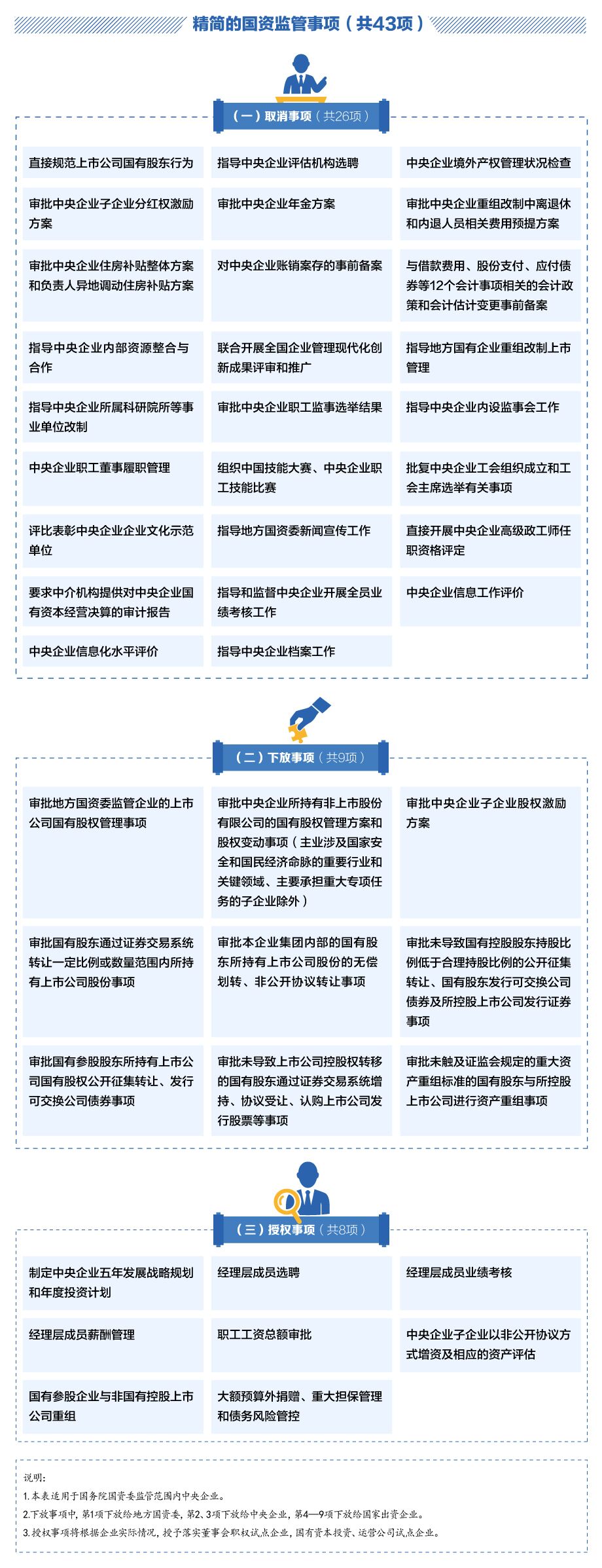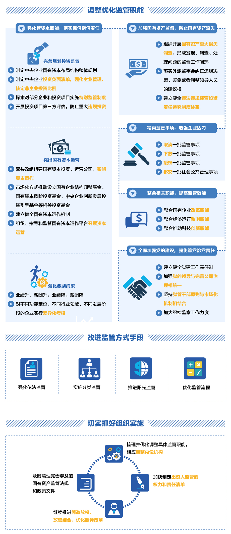 黨的十八大以來,國務(wù)院國資委認真貫徹落實黨中央、國務(wù)院關(guān)于深化國有企業(yè)改革的決策部署,準確把握國有資產(chǎn)監(jiān)管機構(gòu)的出資人代表職責定位,堅定不移深化國有企業(yè)改革,探索完善國有資產(chǎn)監(jiān)管體制機制,積極推進國有企業(yè)結(jié)構(gòu)調(diào)整、創(chuàng)新發(fā)展,為實現(xiàn)國有資產(chǎn)保值增值、防止國有資產(chǎn)流失、發(fā)展壯大國有經(jīng)濟作出了積極貢獻。但與此同時,國有資產(chǎn)監(jiān)督機制尚不健全,國有資產(chǎn)監(jiān)管中越位、缺位、錯位問題依然存在,亟需加快調(diào)整優(yōu)化監(jiān)管職能和方式,推進國有資產(chǎn)監(jiān)管機構(gòu)職能轉(zhuǎn)變,進一步提高國有資本運營和配置效率。4月27日,國務(wù)院辦公廳轉(zhuǎn)發(fā)《國務(wù)院國資委以管資本為主推進職能轉(zhuǎn)變方案》,明確提出調(diào)整優(yōu)化國資監(jiān)管職能,改進監(jiān)管方式手段,著力提高國有資本效率,增強國有企業(yè)活力。文件還明確了精簡的國資監(jiān)管事項共43項。 |