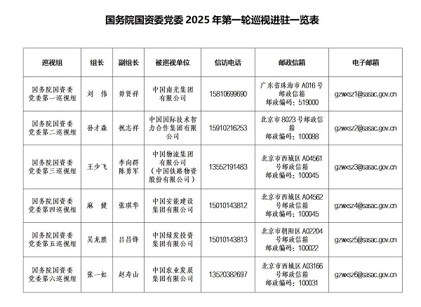 按照國務院國資委黨委和巡視工作領導小組部署安排,截至2025年5月20日,國務院國資委黨委2025年第一輪巡視完成進駐工作。國務院國資委黨委6個巡視組將對中國國際技術智力合作集團有限公司、中國農業(yè)發(fā)展集團有限公司、中國安能建設集團有限公司、中國南光集團有限公司、中國物流集團有限公司、中國綠發(fā)投資集團有限公司等6家企業(yè)黨委開展常規(guī)巡視,對中國物流集團有限公司所屬中國鐵路物資股份有限公司黨委開展提級巡視。