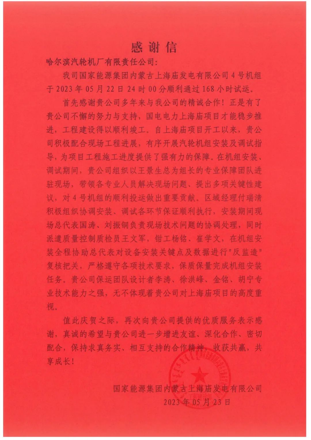 2023年5月22日24時(shí)00分,由哈電集團(tuán)哈電汽輪機(jī)設(shè)計(jì)制造的國家能源集團(tuán)內(nèi)蒙古上海廟發(fā)電有限公司4號汽輪機(jī)組順利通過168小時(shí)試運(yùn)行考核,正式投入商業(yè)運(yùn)營,標(biāo)志著國內(nèi)在建最大煤電項(xiàng)目4臺超超臨界百萬千瓦機(jī)組全部投產(chǎn)發(fā)電。