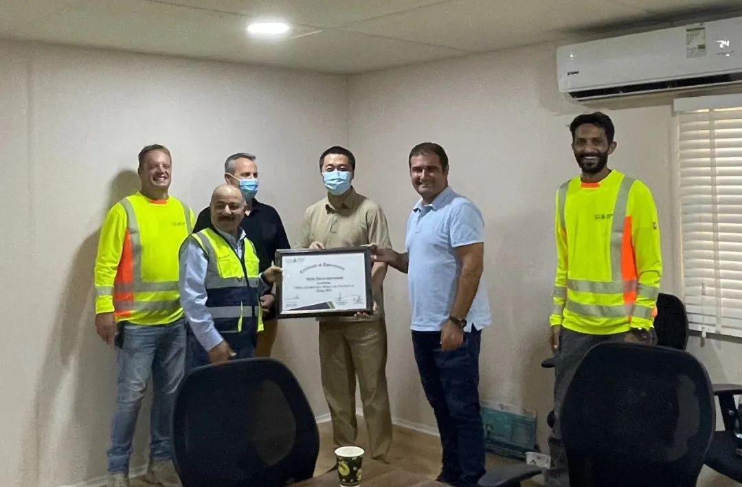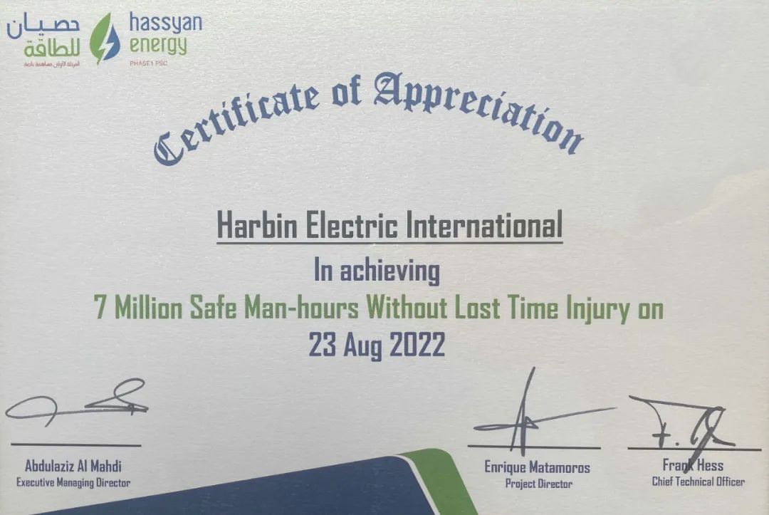 近日,哈電集團國際公司承建的迪拜哈斯彥電站項目現(xiàn)場施工實現(xiàn)700萬安全人工時的安全績效。哈斯彥項目執(zhí)行經(jīng)理Mohammad Abunayyan為哈電國際哈斯彥項目部頒發(fā)了安全管理榮譽證書。