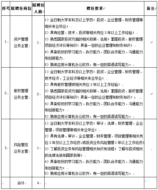 二、投資管理公司招聘崗位、人數(shù)及相關(guān)要求: