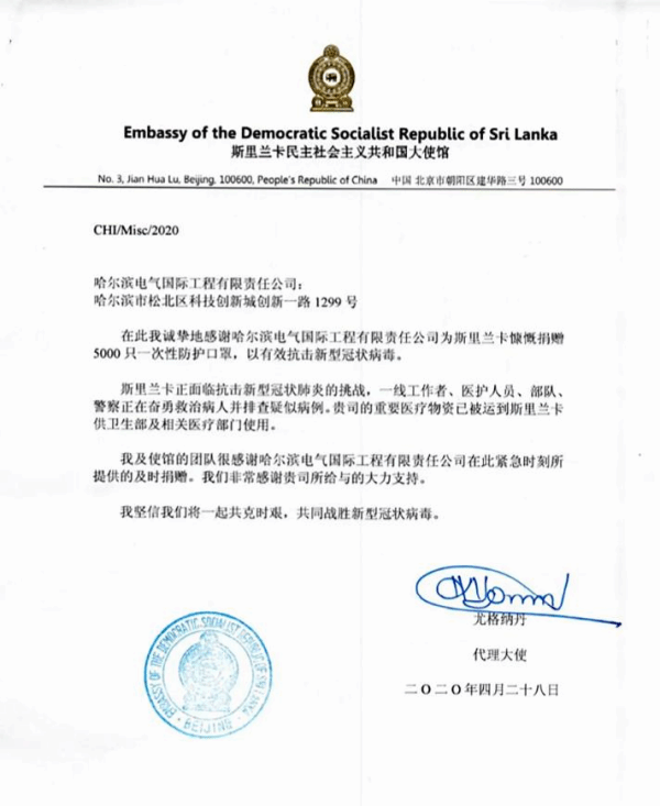 近日,哈電國(guó)際收到一封特殊的感謝信。這封感謝信來自斯里蘭卡民主社會(huì)主義共和國(guó)大使館,信中對(duì)哈電國(guó)際為斯里蘭卡抗擊疫情捐贈(zèng)防護(hù)口罩致以誠(chéng)摯感謝。