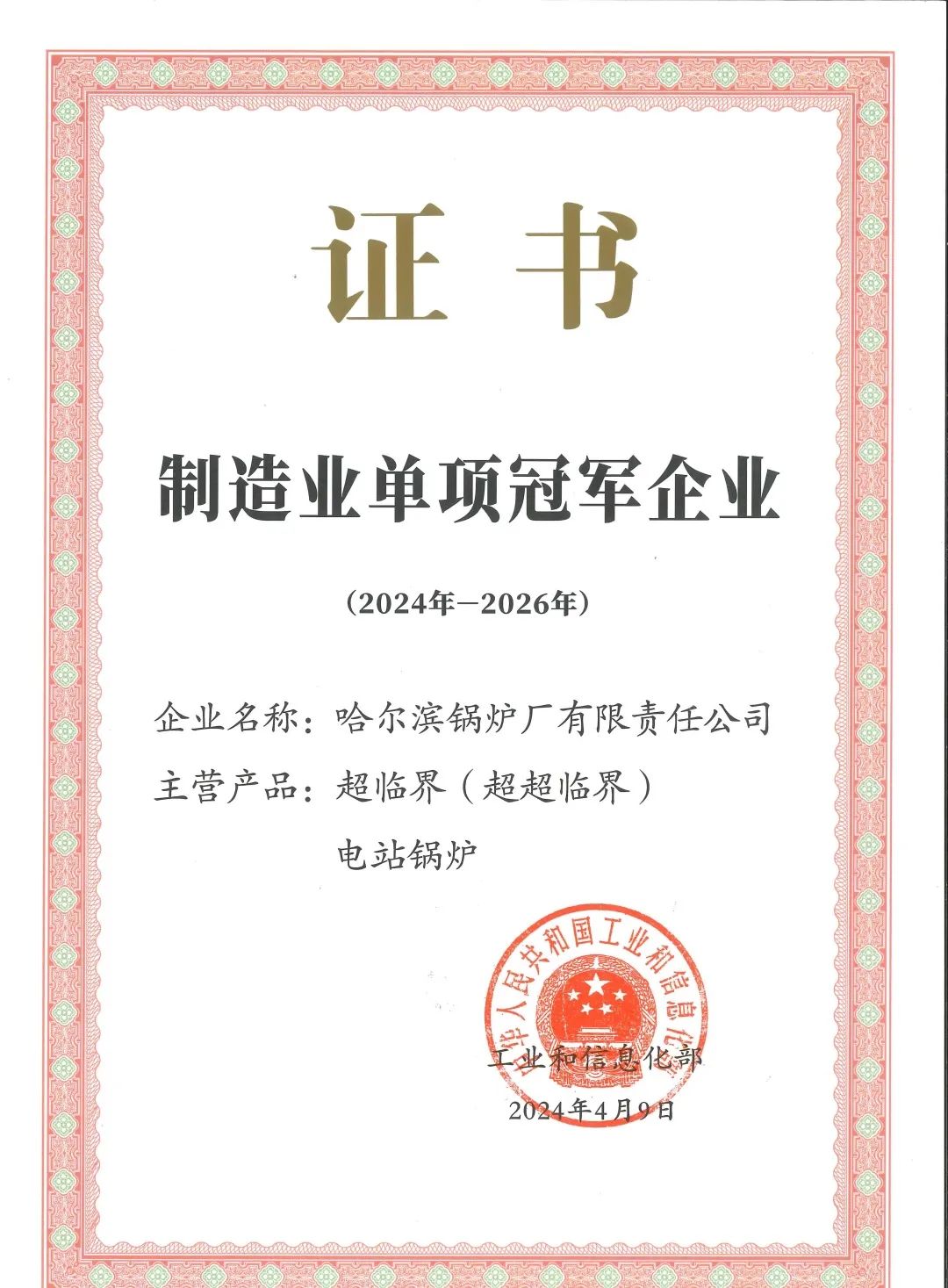 2024年,哈電集團(tuán)鍋爐公司超臨界(超超臨界)電站鍋爐榮獲制造業(yè)單項(xiàng)冠軍企業(yè)。