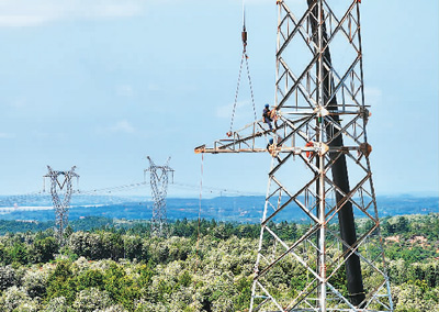 江西500千伏吉安南輸變電工程是江西省重點(diǎn)工程,投運(yùn)后可加強(qiáng)該省吉安市南部電網(wǎng)與吉安主網(wǎng)聯(lián)絡(luò),提升新能源電力消納能力。圖為日前在該項(xiàng)目施工現(xiàn)場(chǎng),電力工人正在高空進(jìn)行輸電鐵塔架設(shè)安裝作業(yè)。