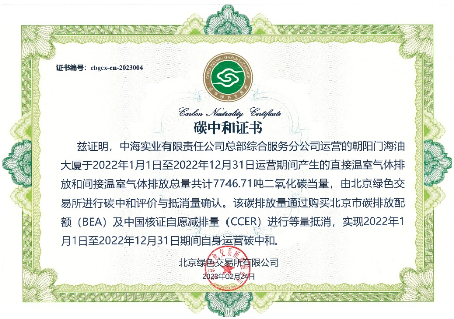北京綠色交易所按照制定碳中和計(jì)劃、實(shí)施減排行動、碳排放核算、北京碳配額及CCER等量抵消,“碳中和”評價(jià)和聲明等全流程要求,支持中國海油總部大樓實(shí)現(xiàn)年度自身運(yùn)營“碳中和”目標(biāo),并頒發(fā)“碳中和”證書。