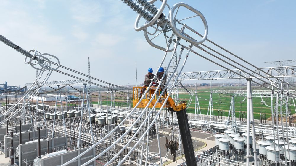 在施工現(xiàn)場(chǎng),天津送變電公司員工進(jìn)行1000千伏引線間隔棒安裝工作。新華社發(fā)