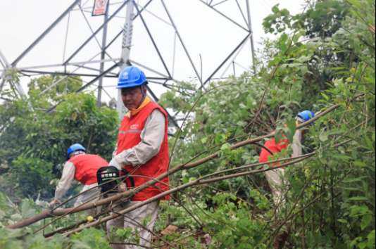 國(guó)網(wǎng)重慶電力員工在500千伏洪板一線237號(hào)塔附近修剪樹(shù)竹。