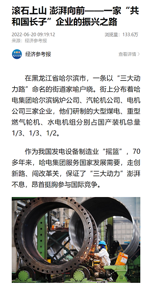 新華社多個(gè)平臺(tái)講述哈電故事:新華社客戶端、《新華每日電訊》刊發(fā)《我國發(fā)電設(shè)備制造業(yè)“搖籃”哈電集團(tuán)競(jìng)逐“綠色賽道”》《哈電集團(tuán)穩(wěn)步推進(jìn)高質(zhì)量發(fā)展》等多篇文章;新華社刊發(fā)《哈電集團(tuán)探索自主創(chuàng)新走出“換擋加速”新路》《“大國重器”企業(yè)轉(zhuǎn)型面臨多重挑戰(zhàn)》等文章。經(jīng)濟(jì)參考報(bào)專版刊發(fā)《滾石上山 澎湃向前——一家“共和國長子”企業(yè)的振興之路》閱讀量近140萬。