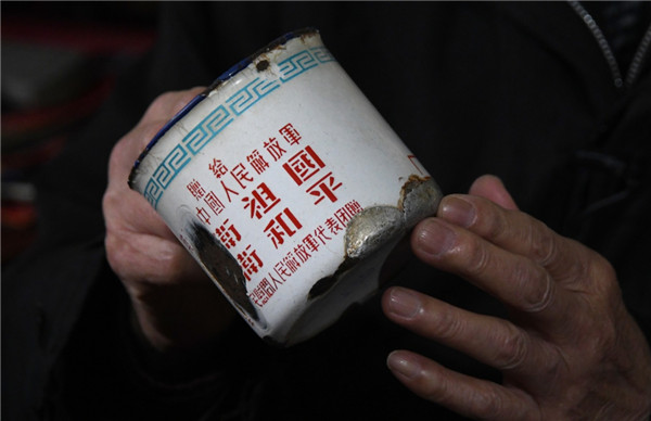 多年來,他只是小心翼翼地,把1954年“全國(guó)人民慰問人民解放軍代表團(tuán)”頒發(fā)的一個(gè)搪瓷缸,擺在觸手可及的地方。這只補(bǔ)了又補(bǔ)、不能再用的缸子上,一面是天安門、和平鴿,一面寫著:贈(zèng)給英勇的中國(guó)人民解放軍——保衛(wèi)祖國(guó)、保衛(wèi)和平。