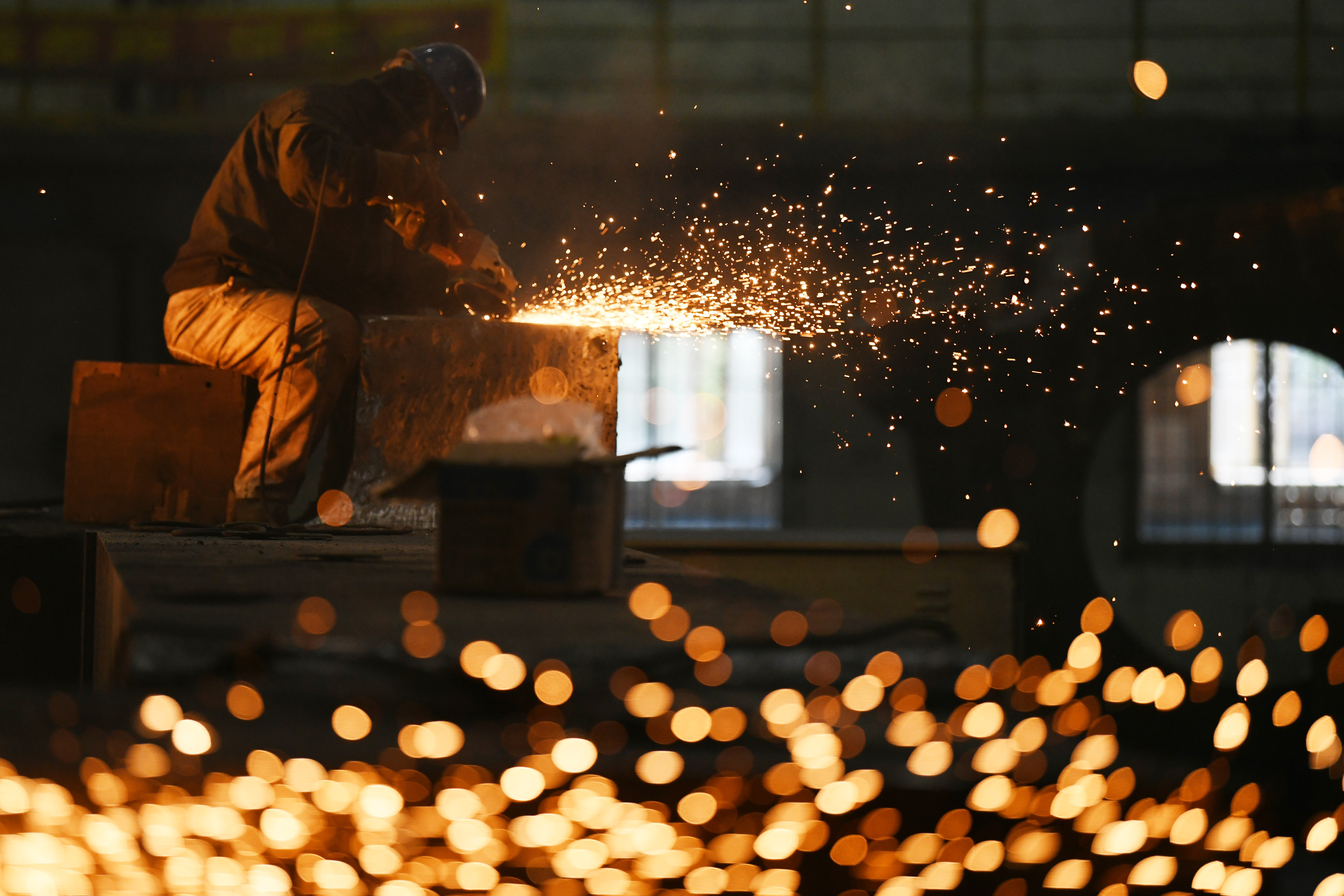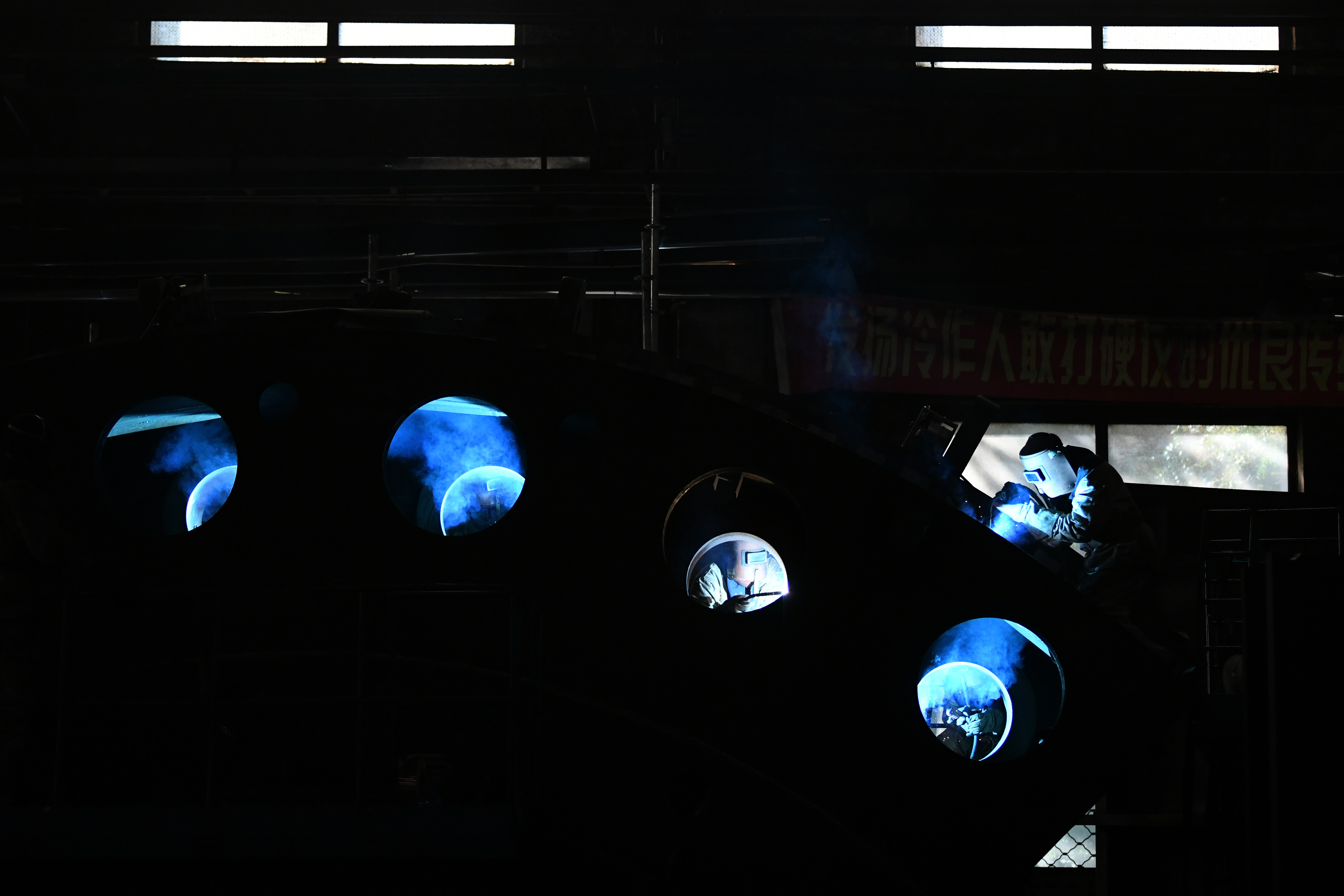 ↑在中國一重集團(tuán)有限公司的廠房?jī)?nèi),工人在進(jìn)行生產(chǎn)作業(yè)(8月27日攝)。