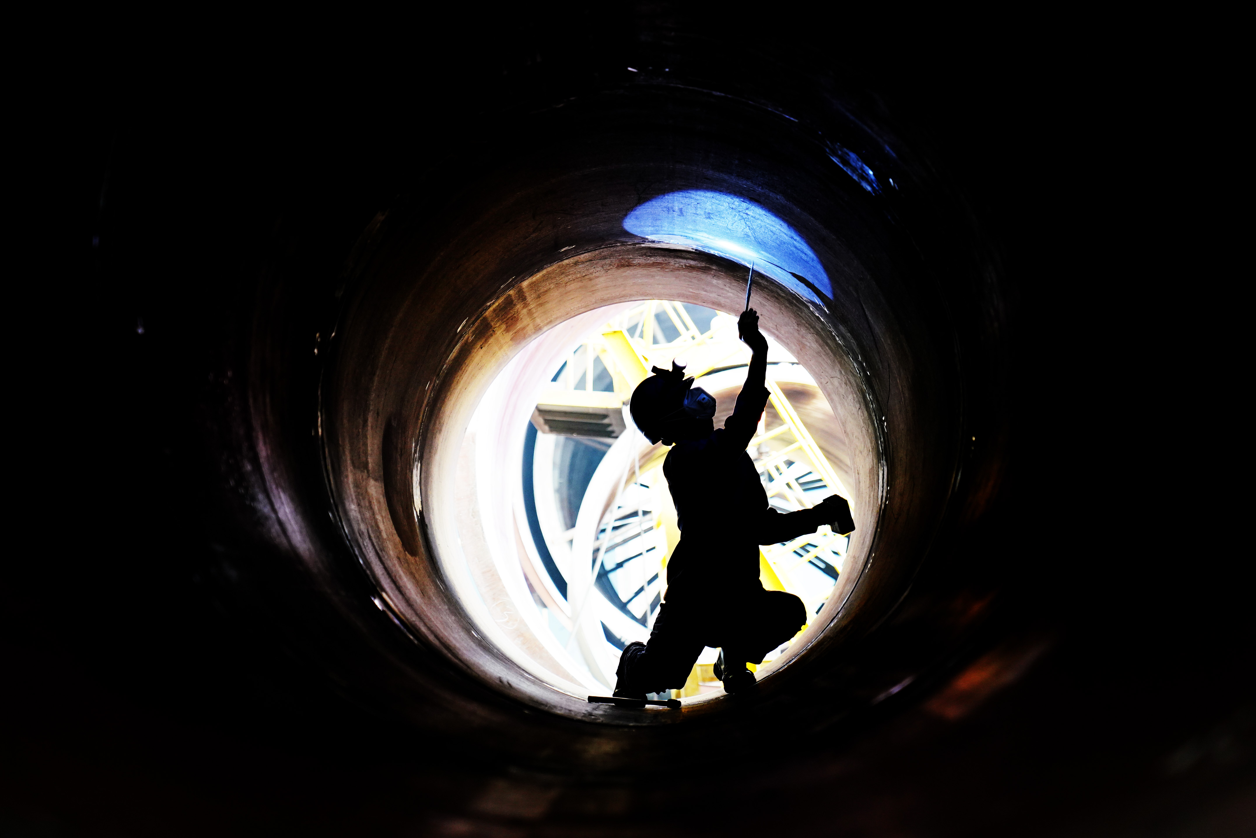 ↑在哈電集團(tuán)哈爾濱鍋爐廠有限責(zé)任公司廠房?jī)?nèi),工人在進(jìn)行生產(chǎn)作業(yè)(9月4日攝)。