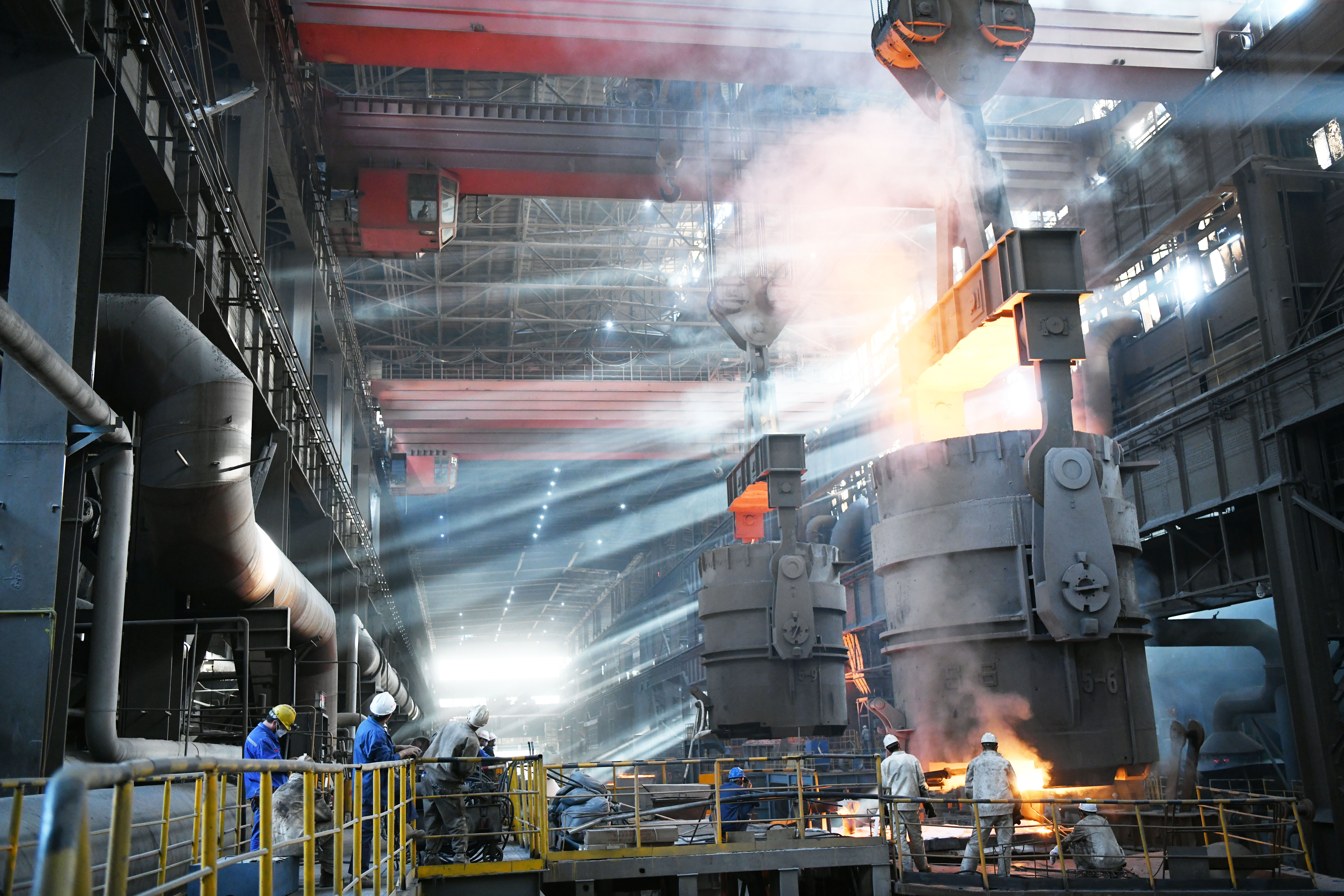 ↑在中國一重集團(tuán)有限公司的廠房?jī)?nèi),工人在進(jìn)行生產(chǎn)作業(yè)(8月29日攝)。